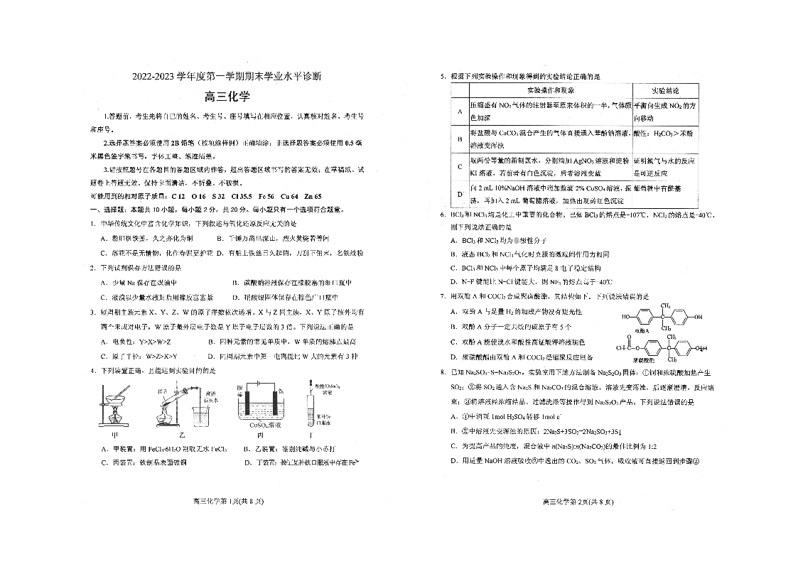 山东省烟台市2023.1高三年级期末考试化学