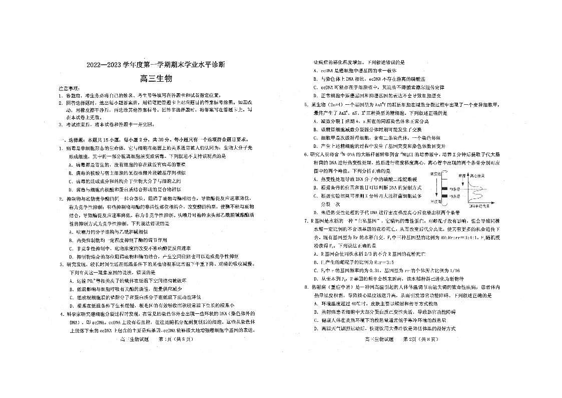 山东省烟台市2023.1高三年级期末考试生物