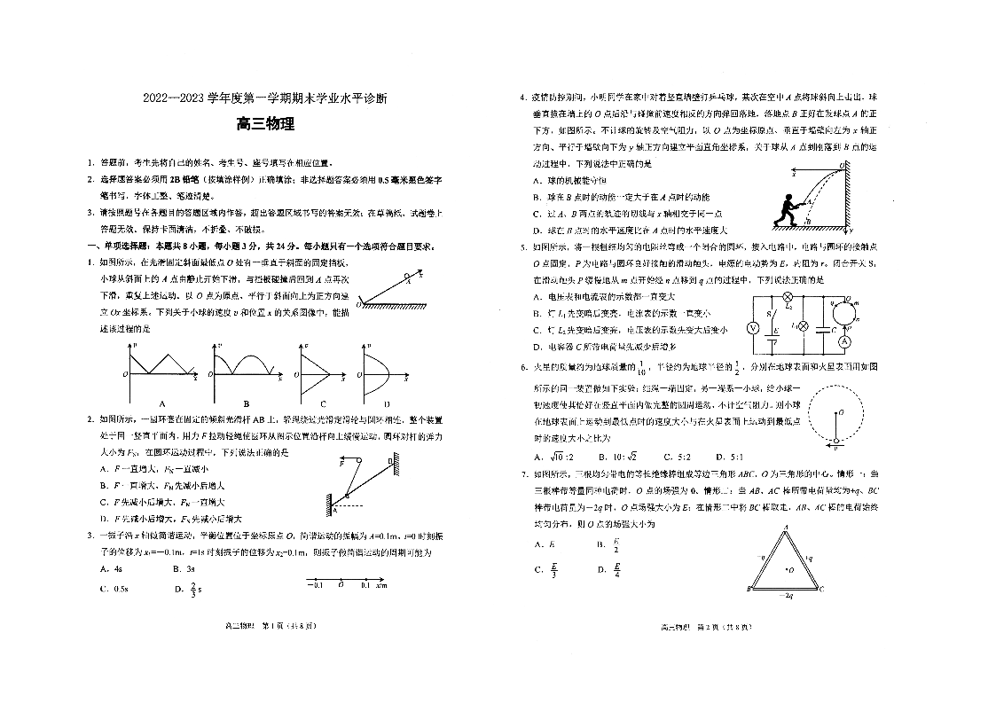 山东省烟台市2023.1高三年级期末考试物理