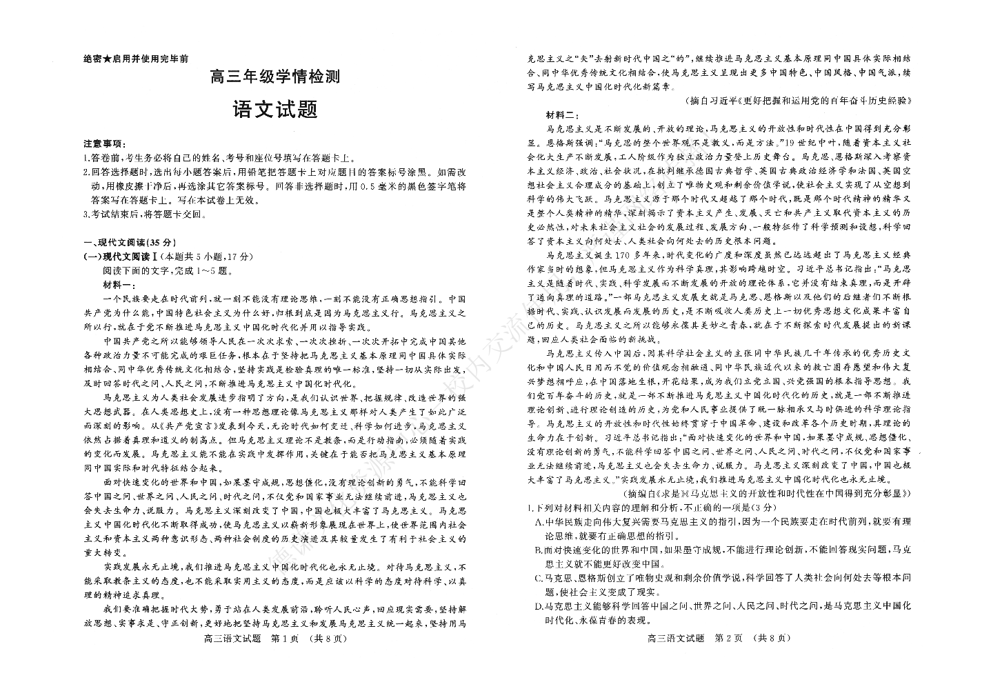 1山东省济南市2023.2高三年级开学学情检测语文