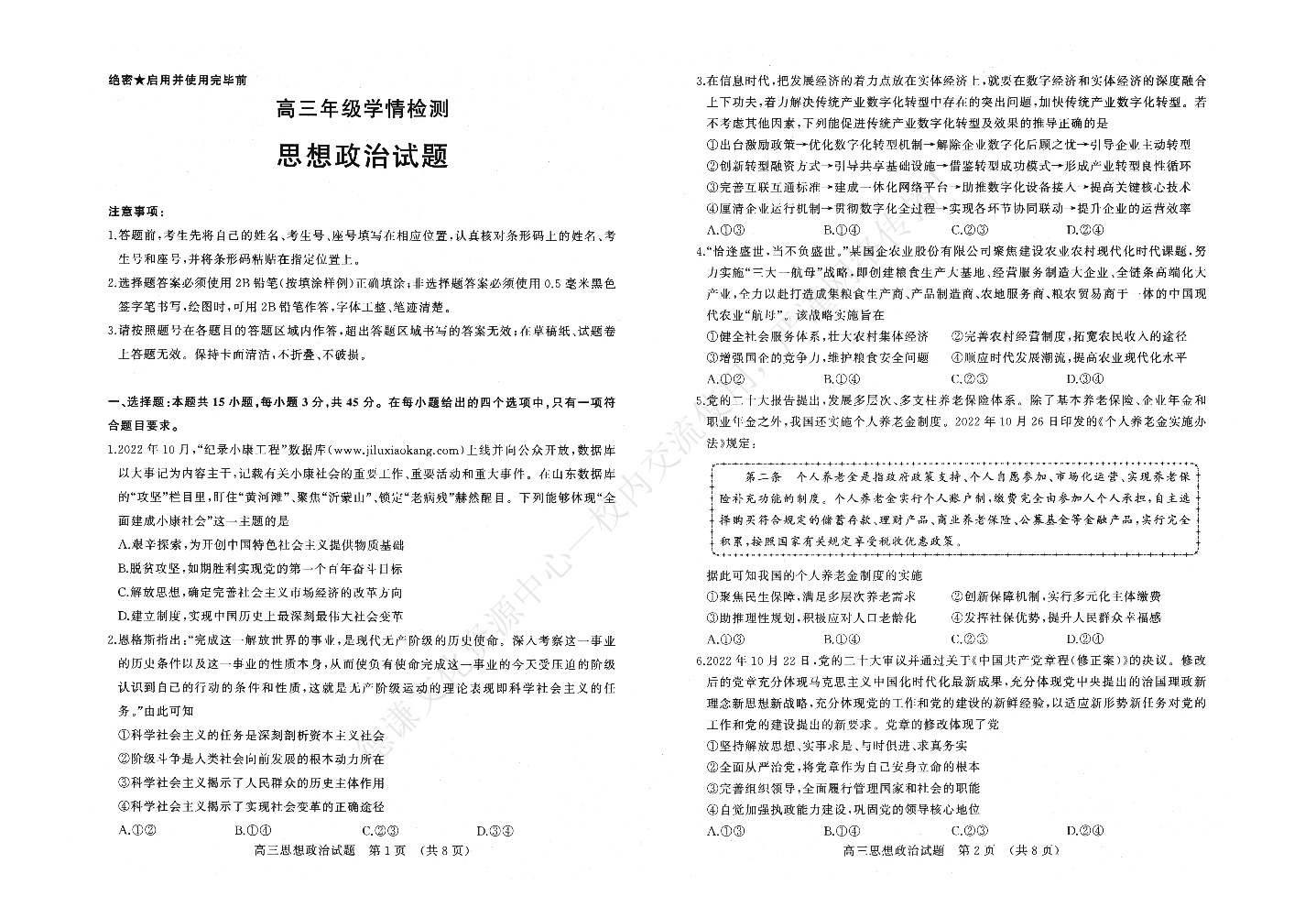 山东省济南市2023.2高三年级开学学情检测政治