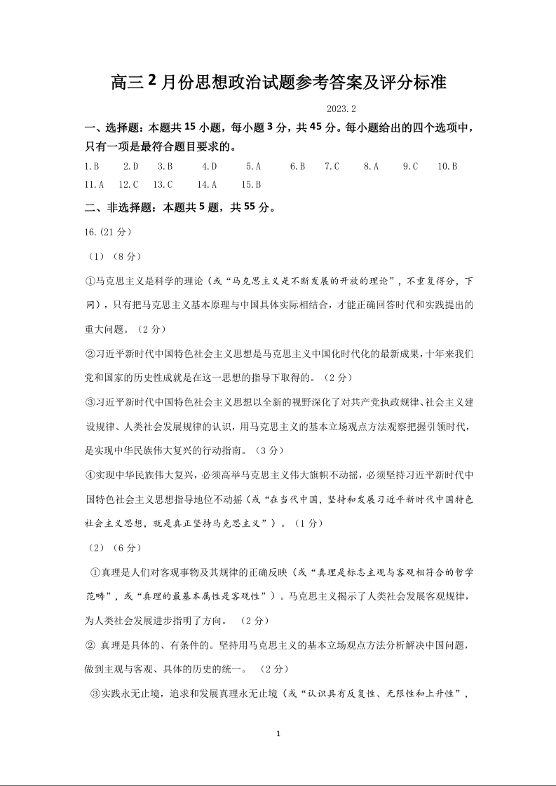 山东省济南市2023.2高三年级开学学情检测政治答案