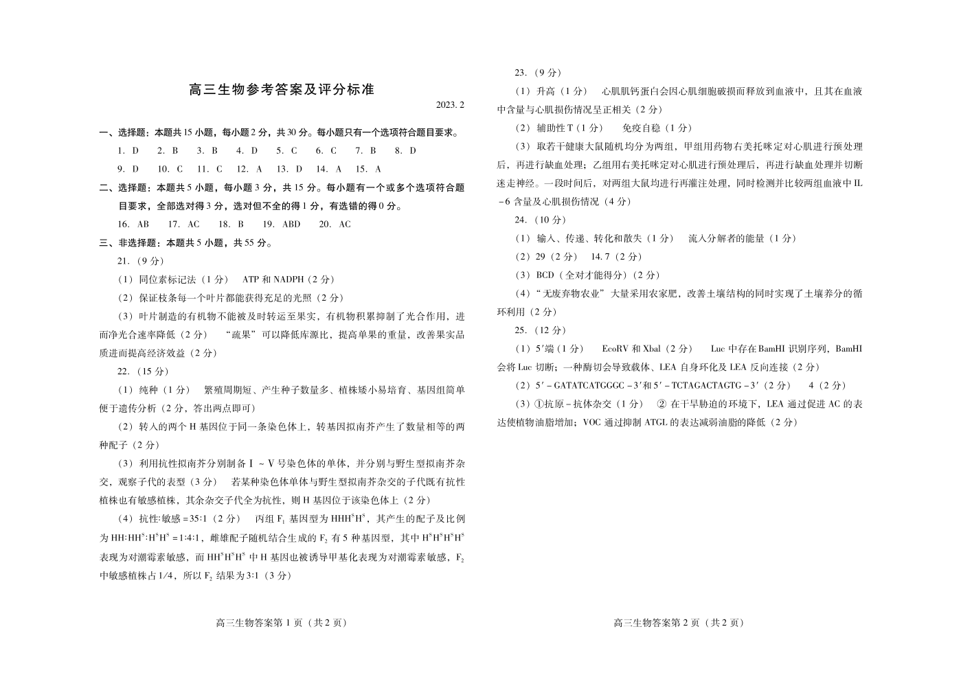 山东省潍坊市2023.2高三年级第一次模拟考试生物答案