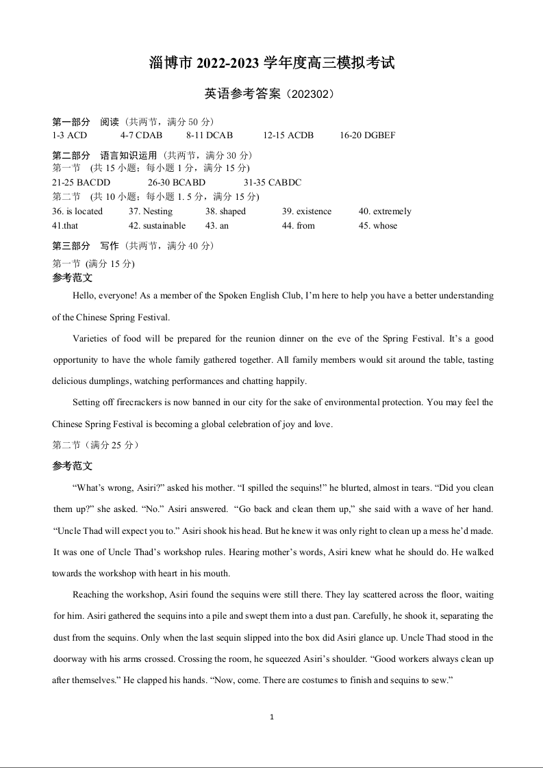 3山东省淄博市2023.2高三年级第一次模拟考试英语答案