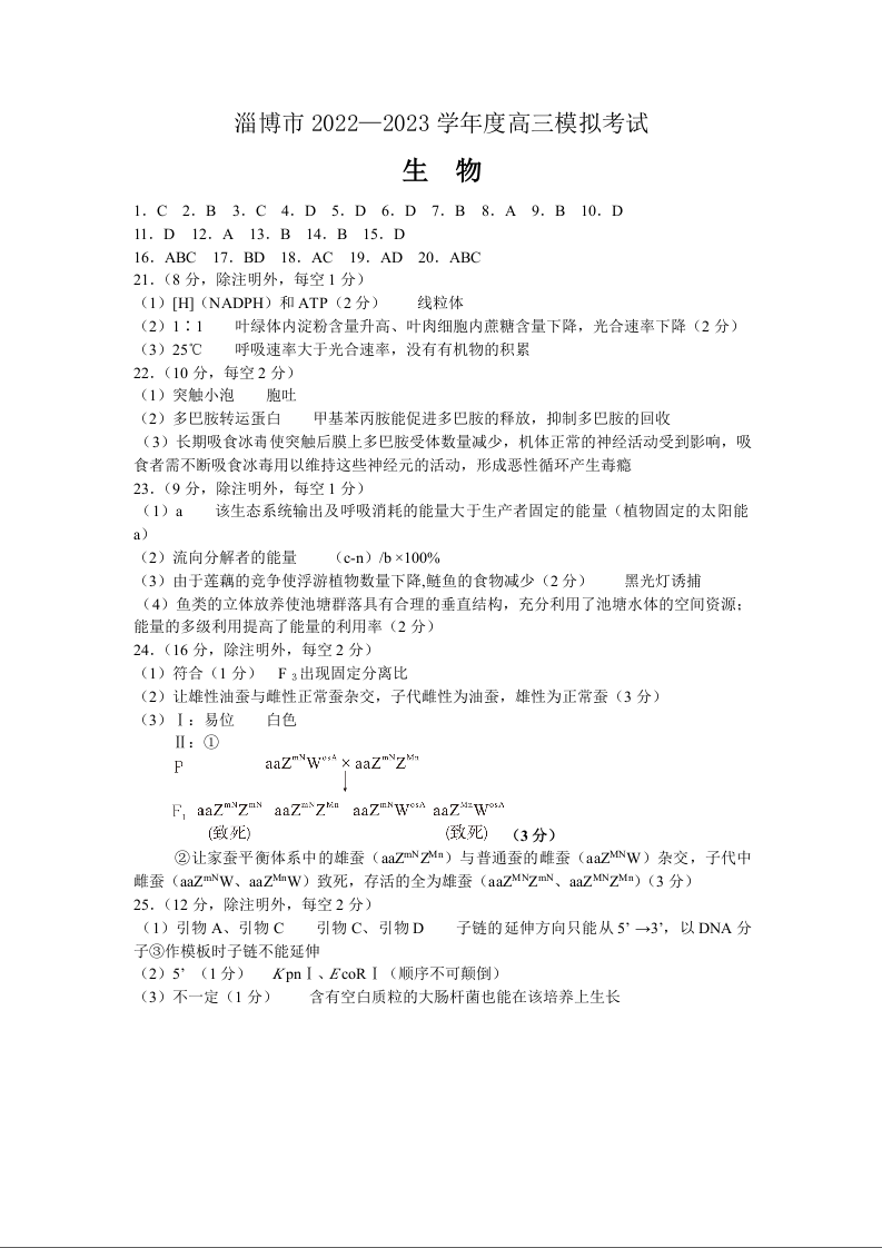山东省淄博市2023.2高三年级第一次模拟考试生物答案