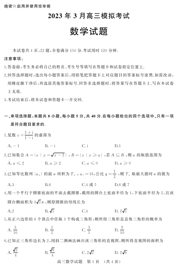 2山东省济南市2023.3高三年级第一次模拟考试数学