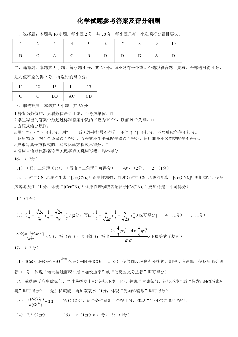 山东省济南市2023.3高三年级第一次模拟考试化学答案