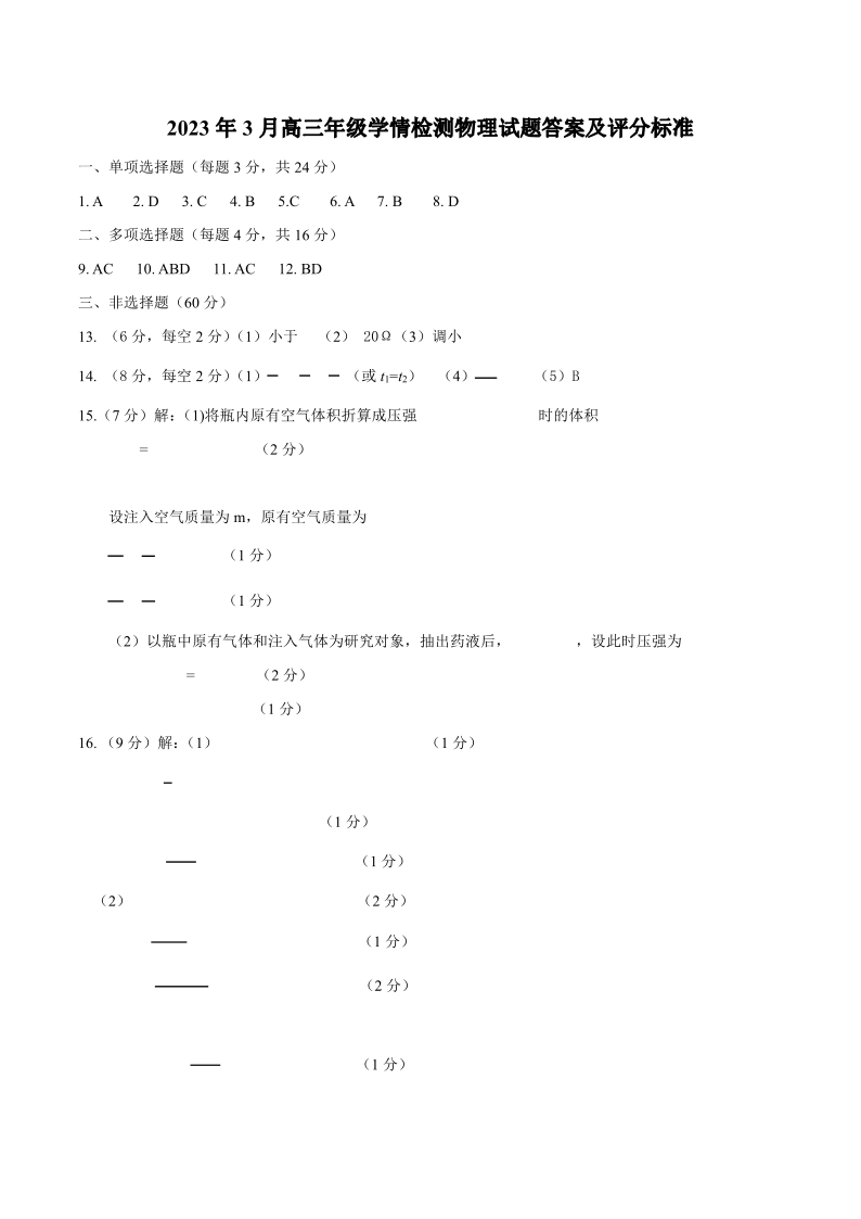 山东省济南市2023.3高三年级第一次模拟考试物理答案