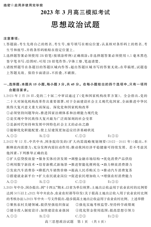 山东省济南市2023.3高三年级第一次模拟考试政治