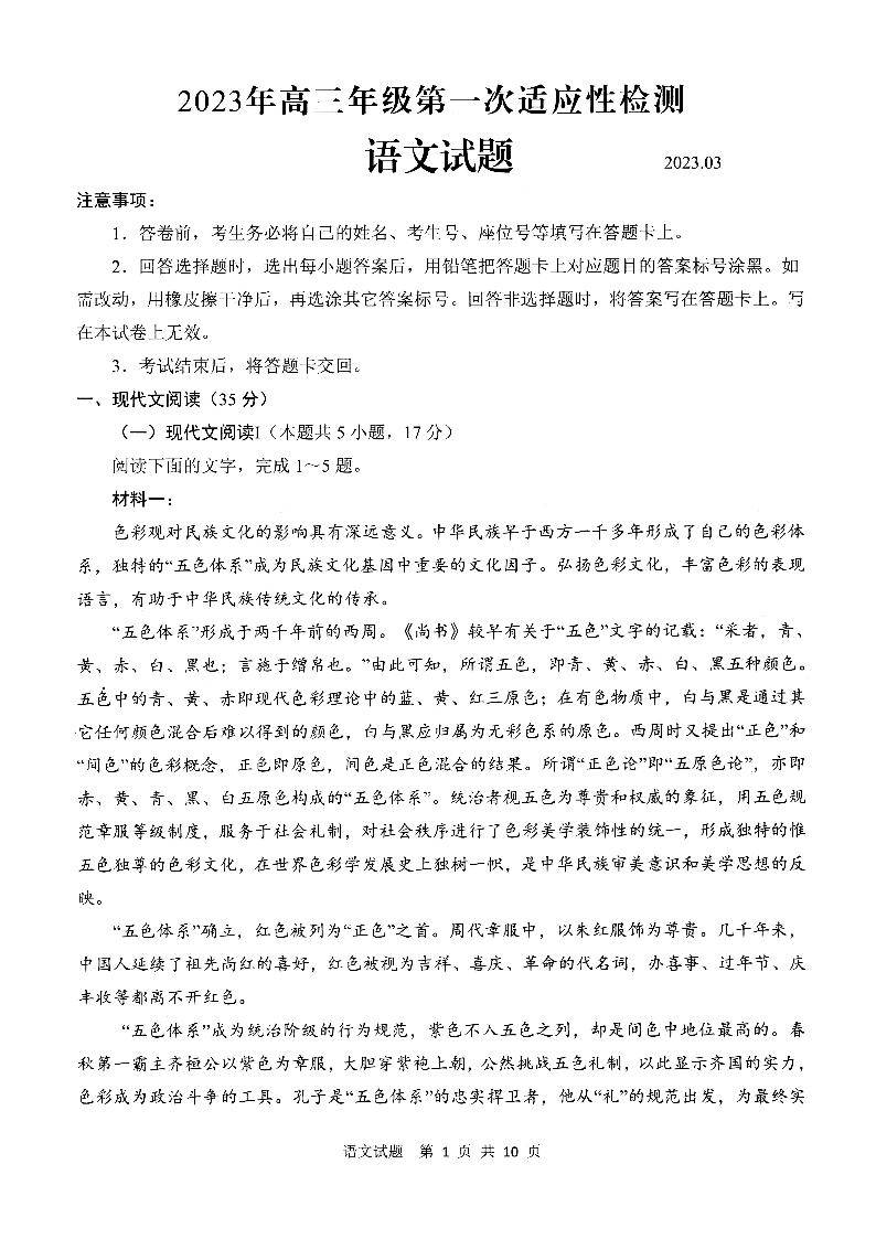 1山东省青岛市2023.3高三年级第一次模拟考试语文