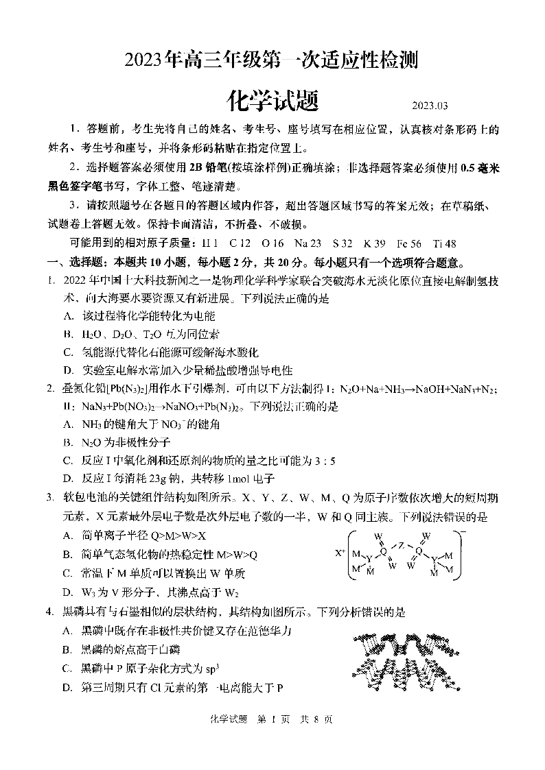 山东省青岛市2023.3高三年级第一次模拟考试化学