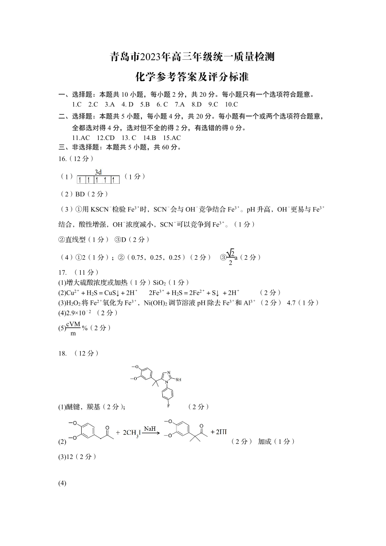 山东省青岛市2023.3高三年级第一次模拟考试化学答案