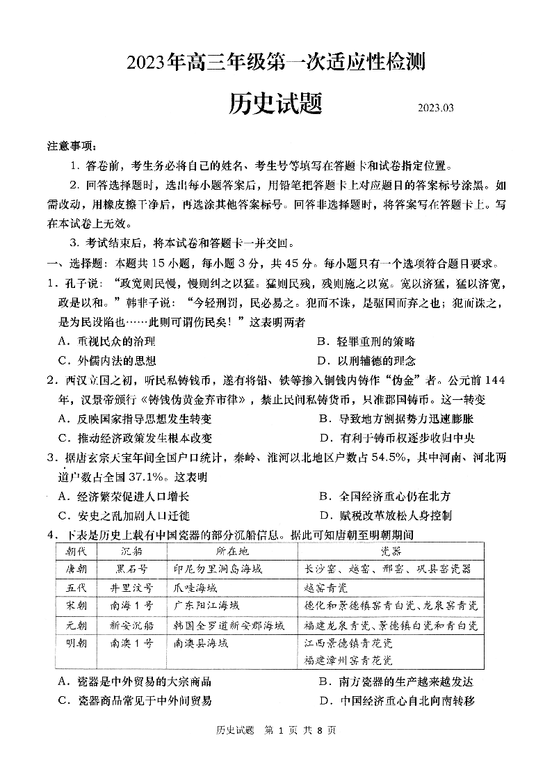 山东省青岛市2023.3高三年级第一次模拟考试历史