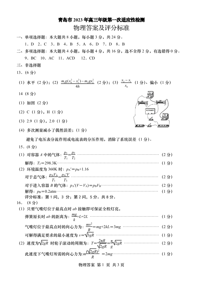 山东省青岛市2023.3高三年级第一次模拟考试物理答案