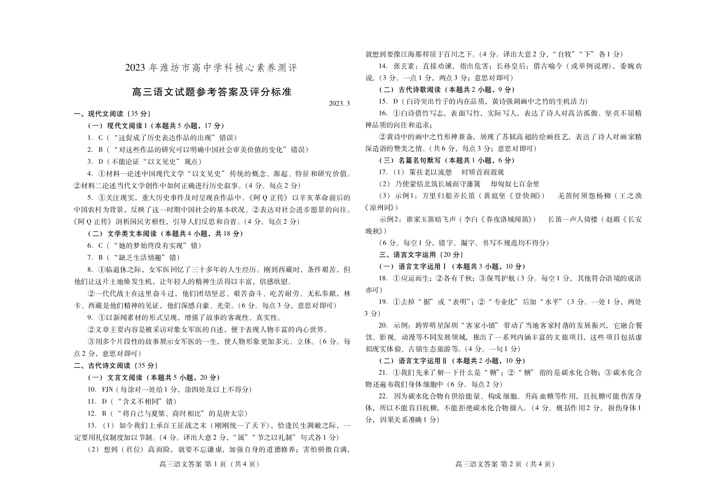 1山东省潍坊市2023.3高三年级优生素养测评语文答案