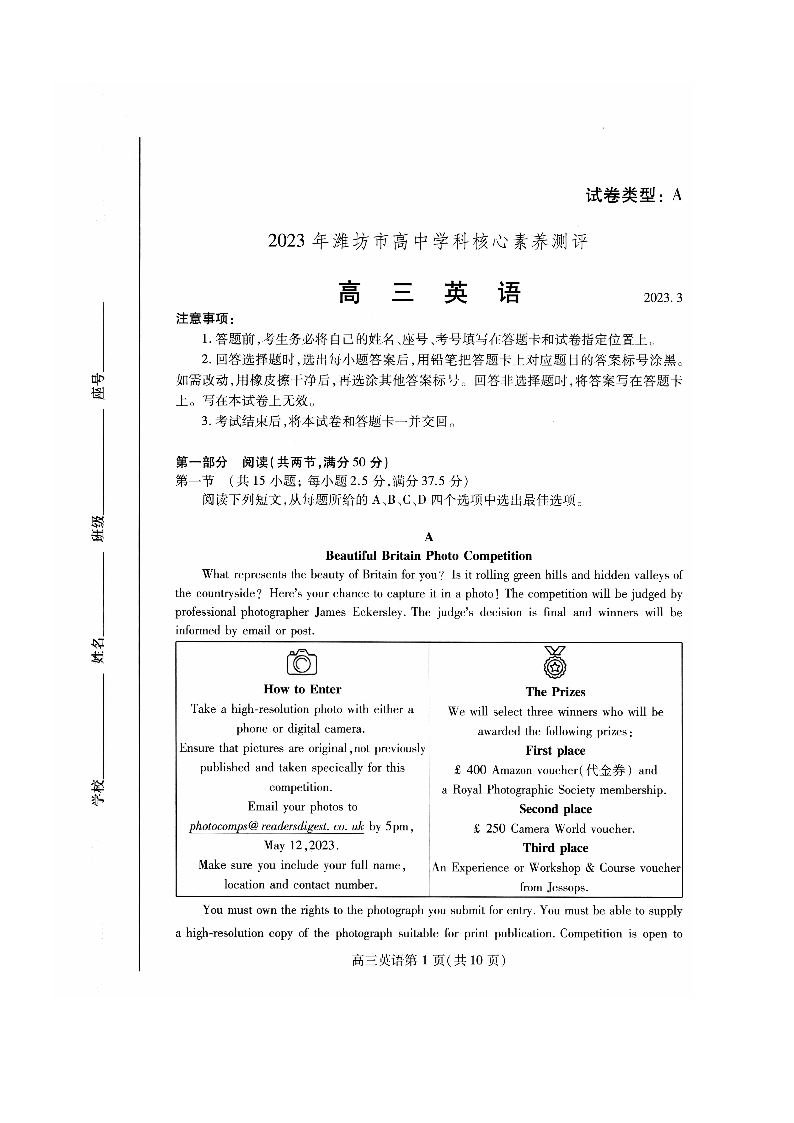 3山东省潍坊市2023.3高三年级优生素养测评英语