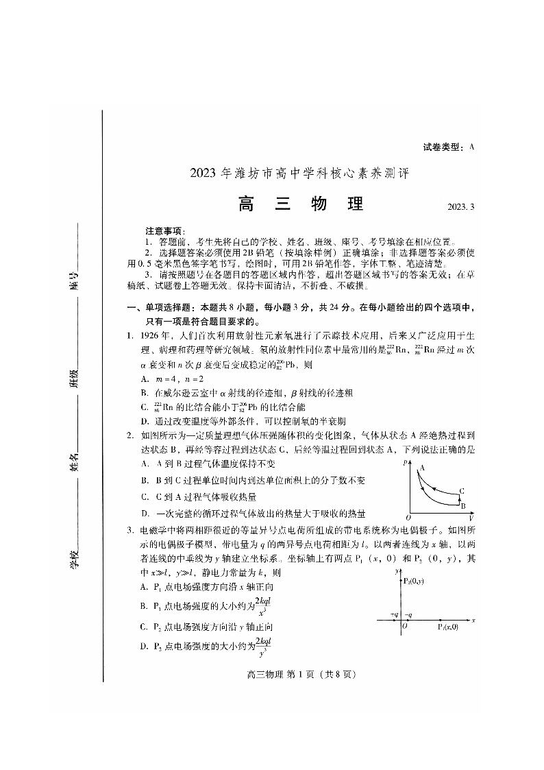 山东省潍坊市2023.3高三年级优生素养测评物理