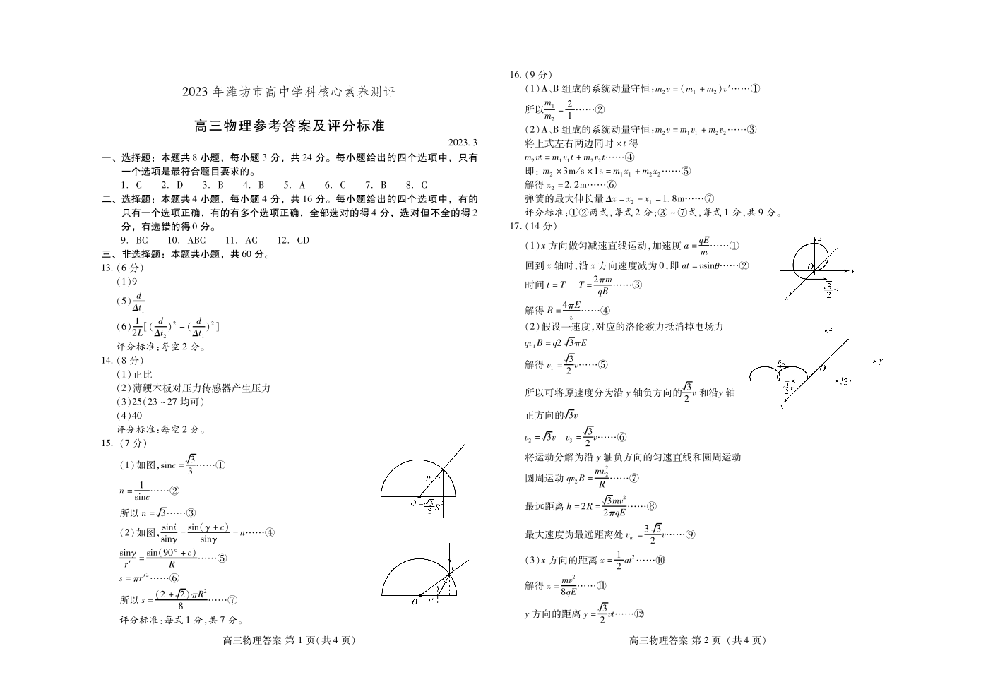 山东省潍坊市2023.3高三年级优生素养测评物理答案