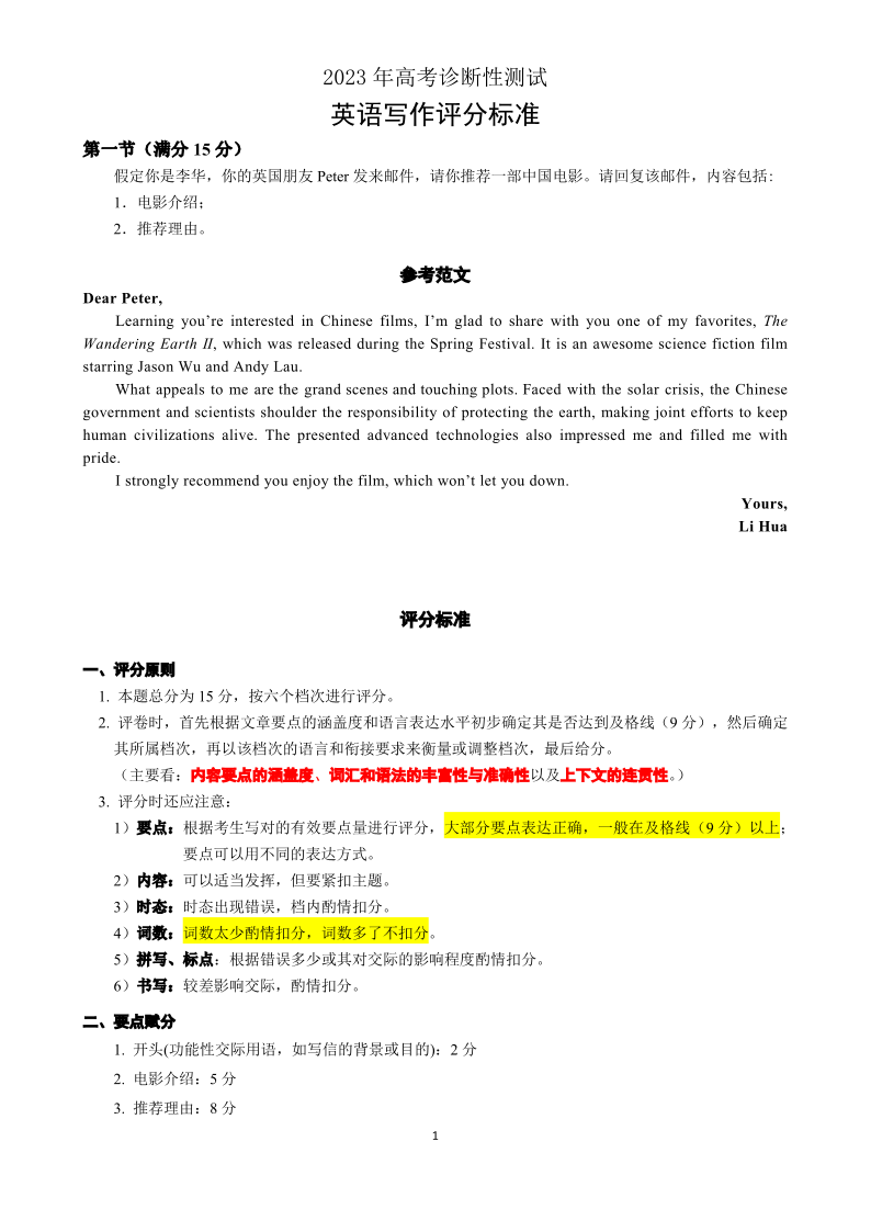 3山东省烟台市2023.3高三年级第一次模拟考试英语写作评分标准