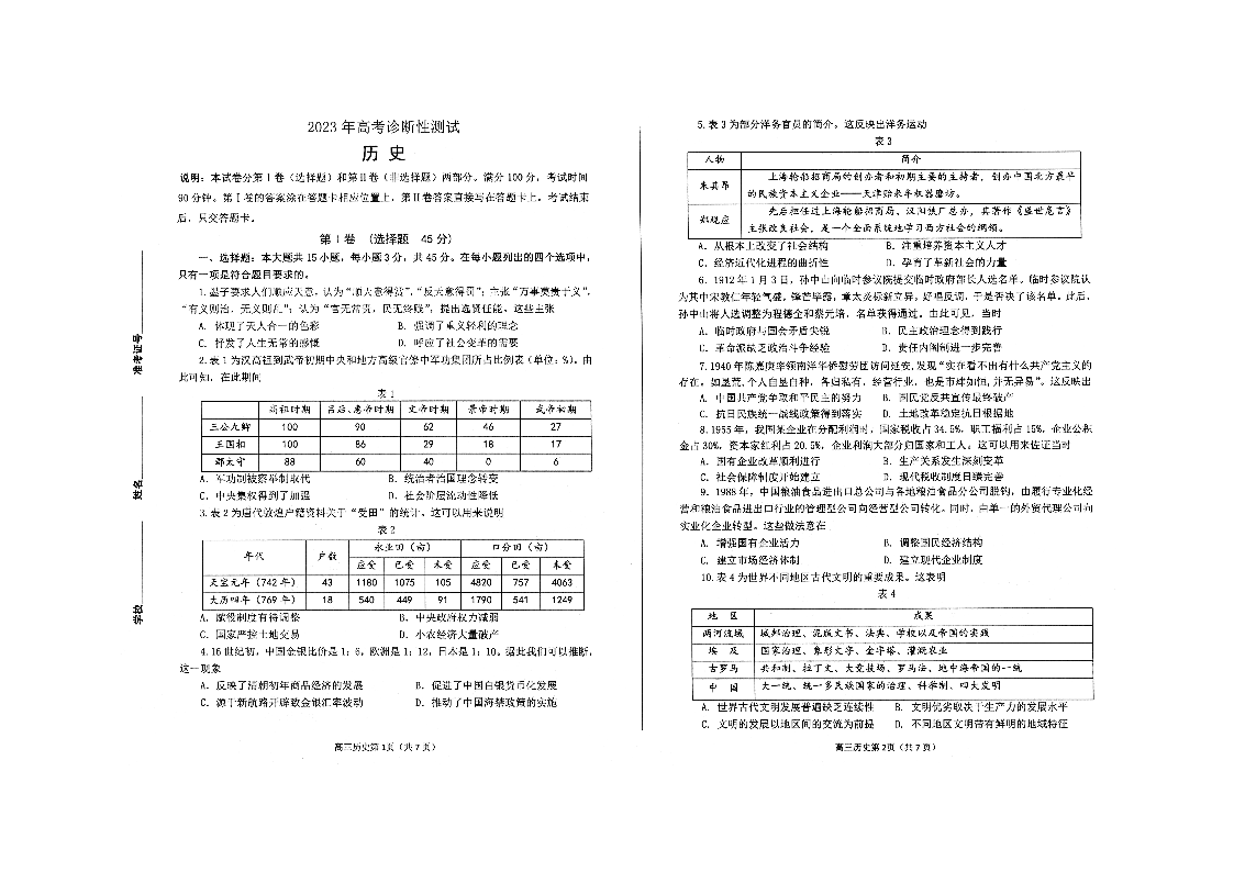 山东省烟台市2023.3高三年级第一次模拟考试历史