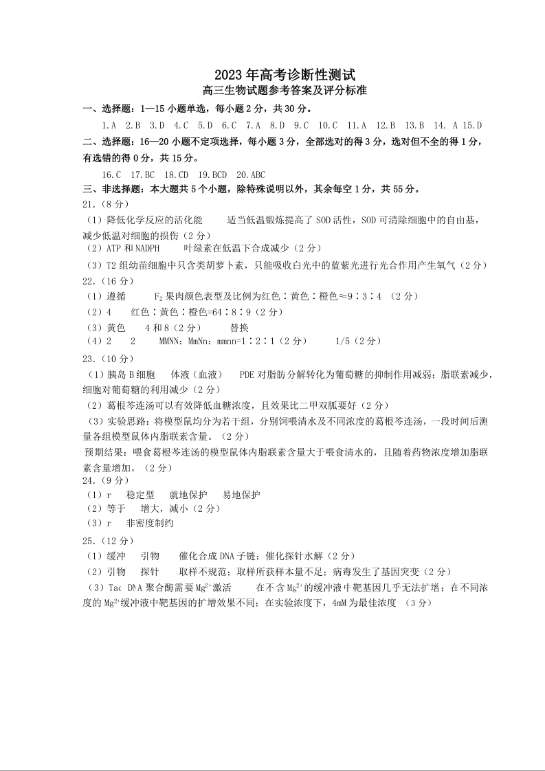 山东省烟台市2023.3高三年级第一次模拟考试生物答案
