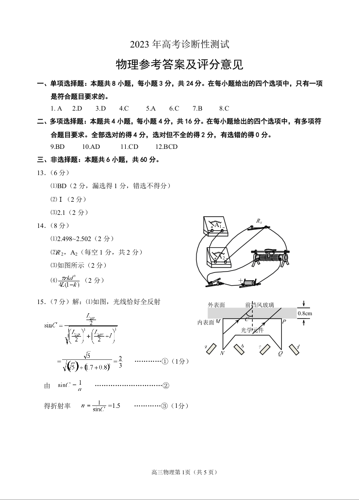 山东省烟台市2023.3高三年级第一次模拟考试物理答案