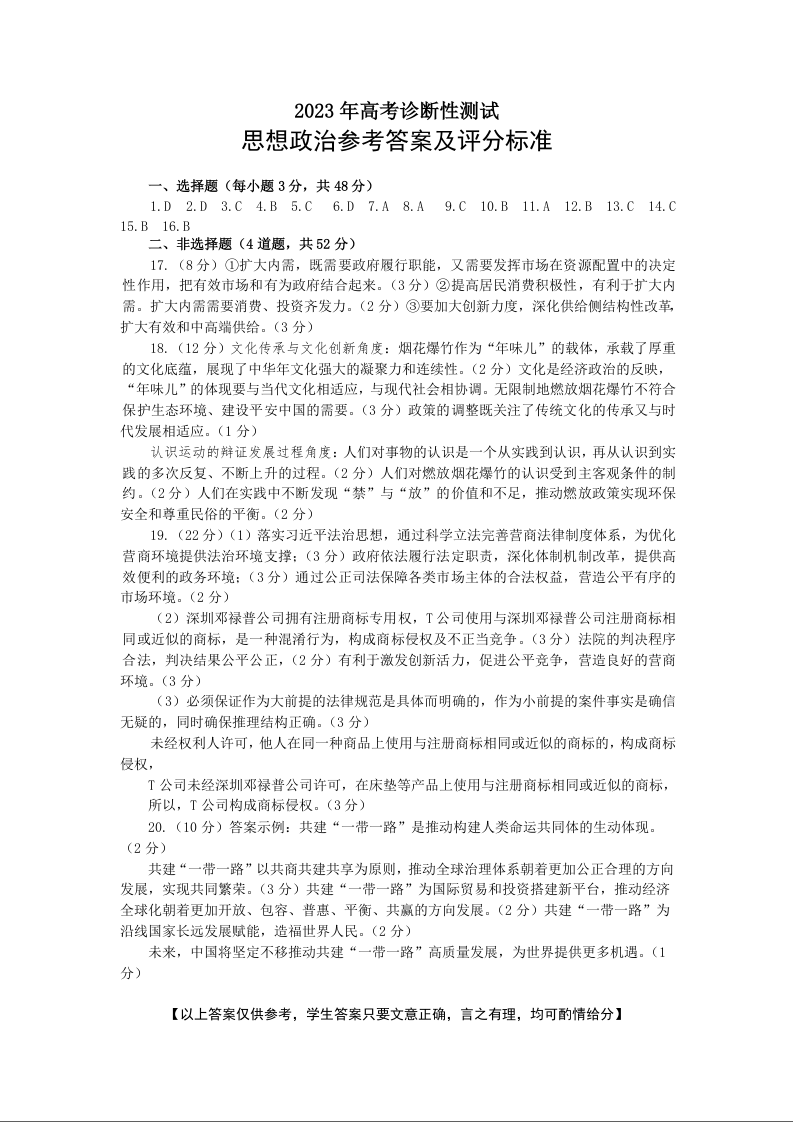 山东省烟台市2023.3高三年级第一次模拟考试政治答案