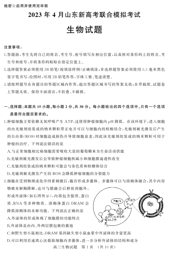6山东省济南市2023.4高三年级第二次模拟考试生物