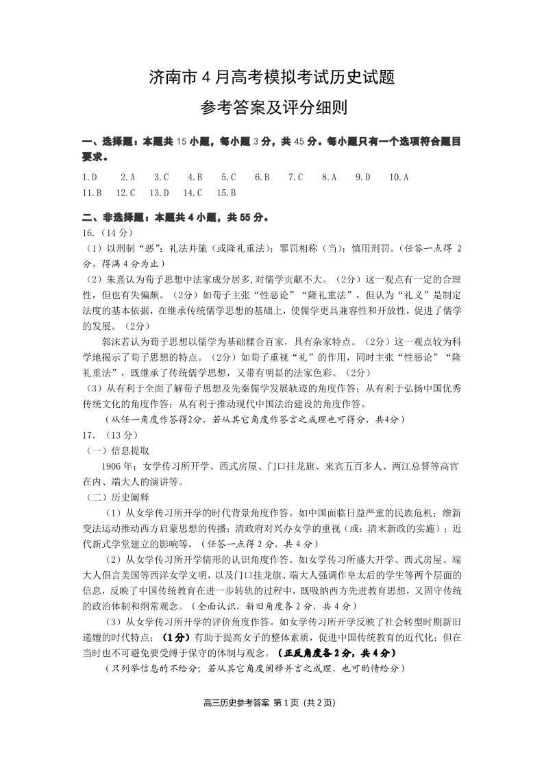 8山东省济南市2023.4高三年级第二次模拟考试历史答案