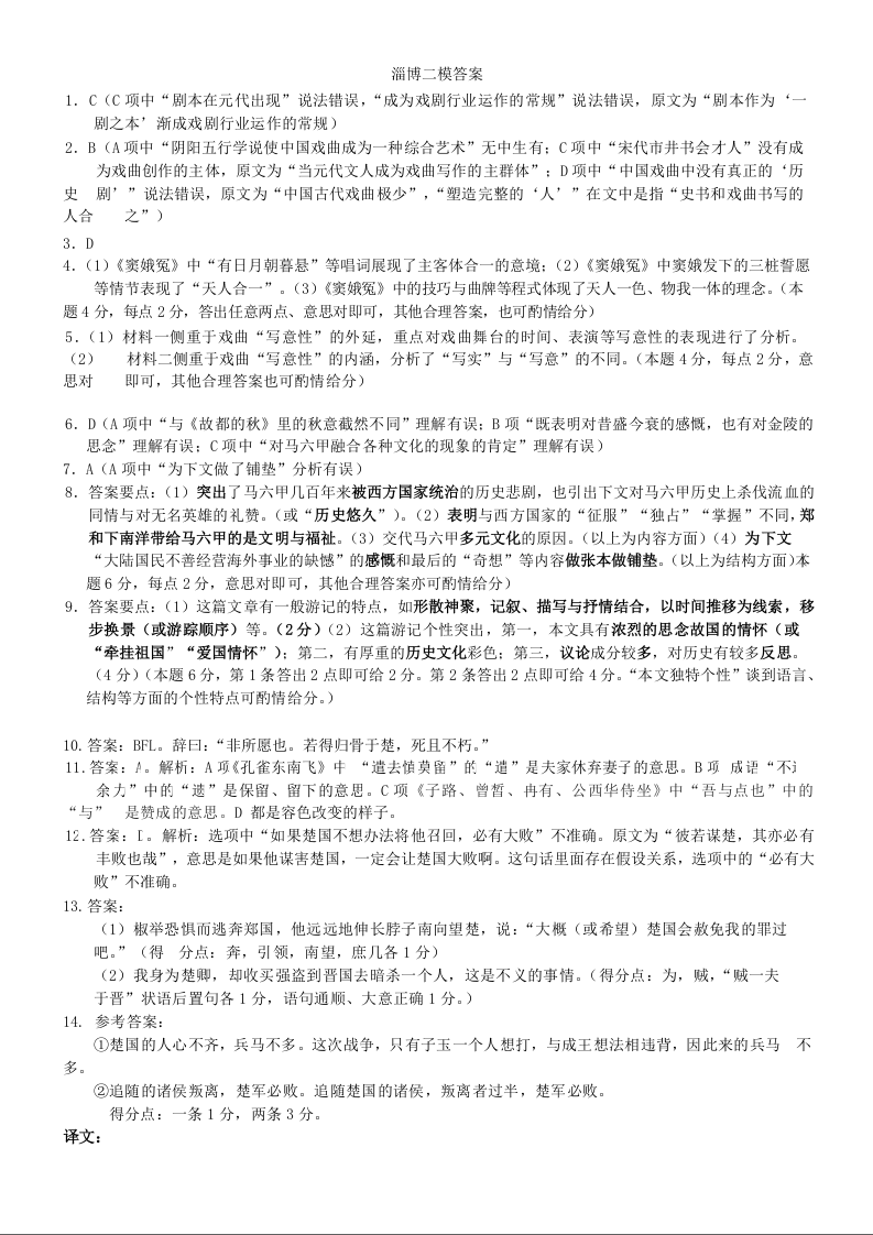 1山东省淄博市2023.4高三年级第二次模拟考试语文答案