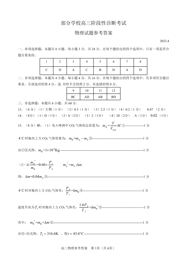 5山东省淄博市2023.4高三年级第二次模拟考试物理答案