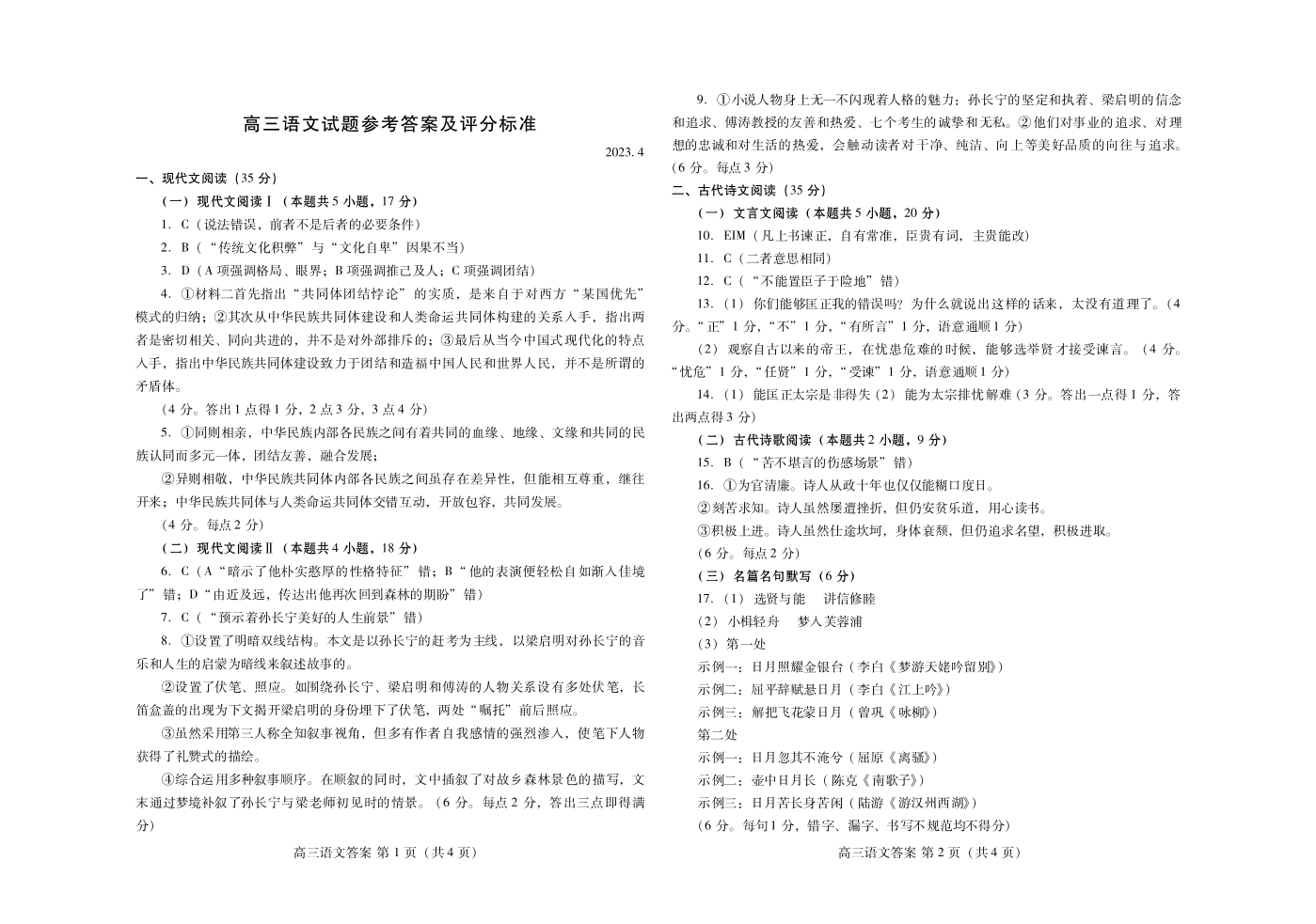 1山东省潍坊市2023.4高三年级第二次模拟考试语文答案