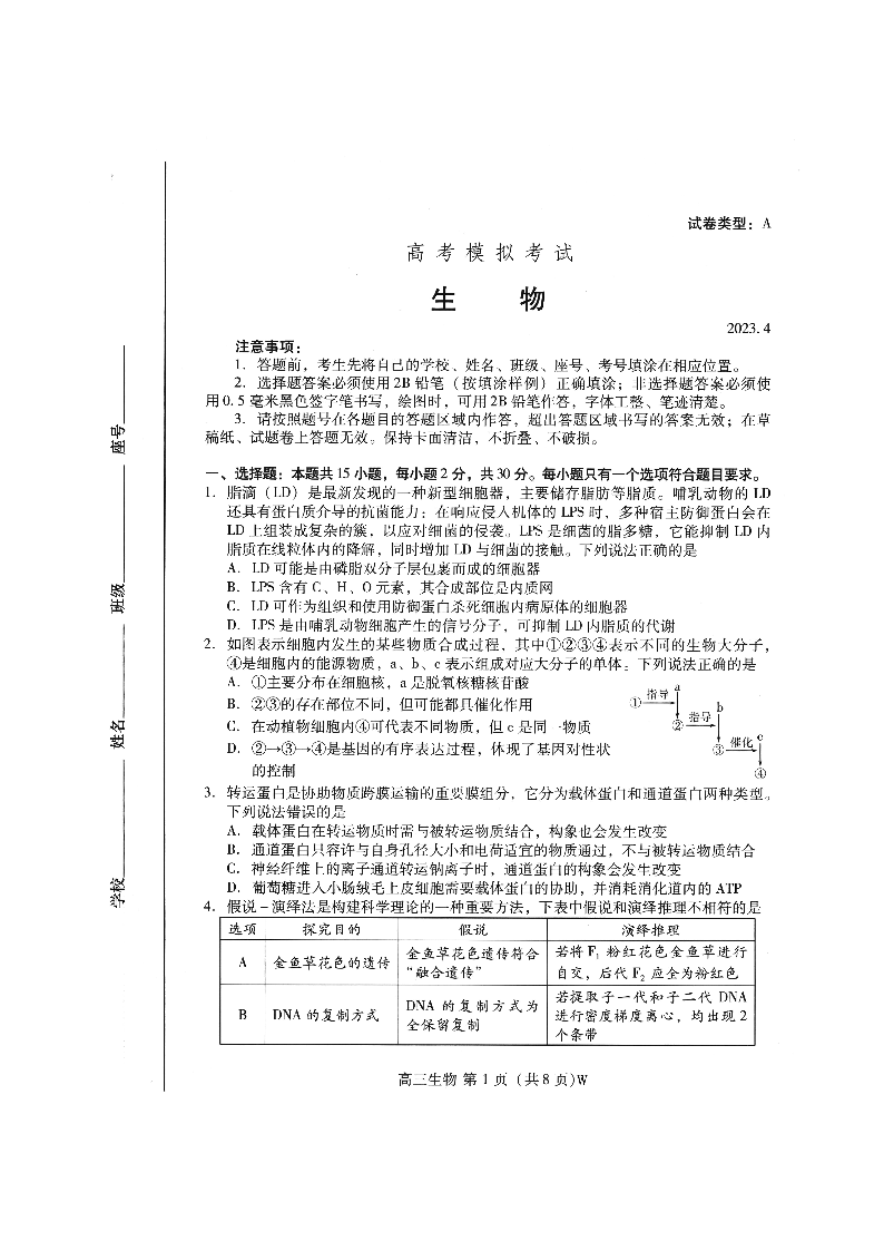 7山东省潍坊市2023.4高三年级第二次模拟考试生物