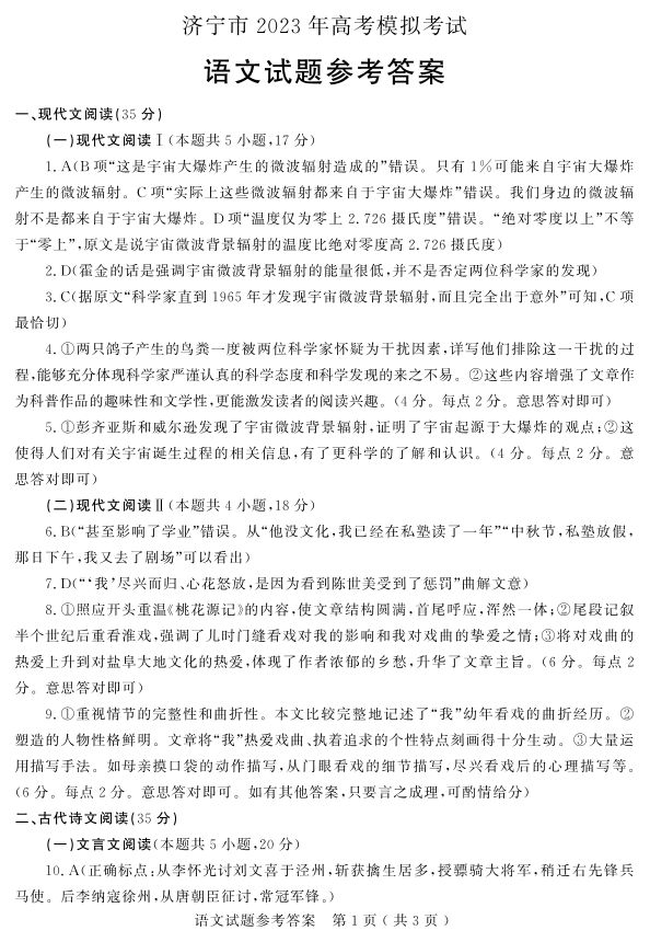 1山东省济宁市2023.4高三年级第二次模拟考试语文答案