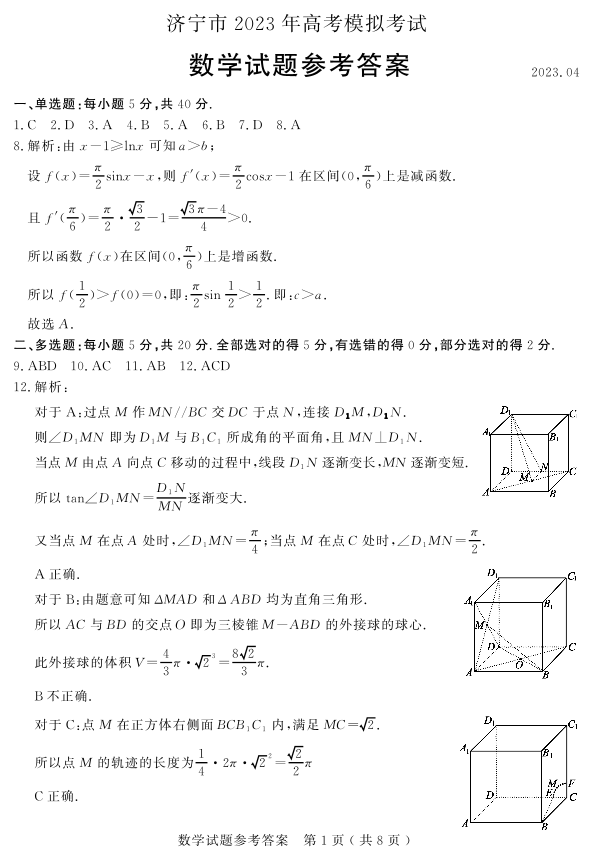 2山东省济宁市2023.4高三年级第二次模拟考试数学答案