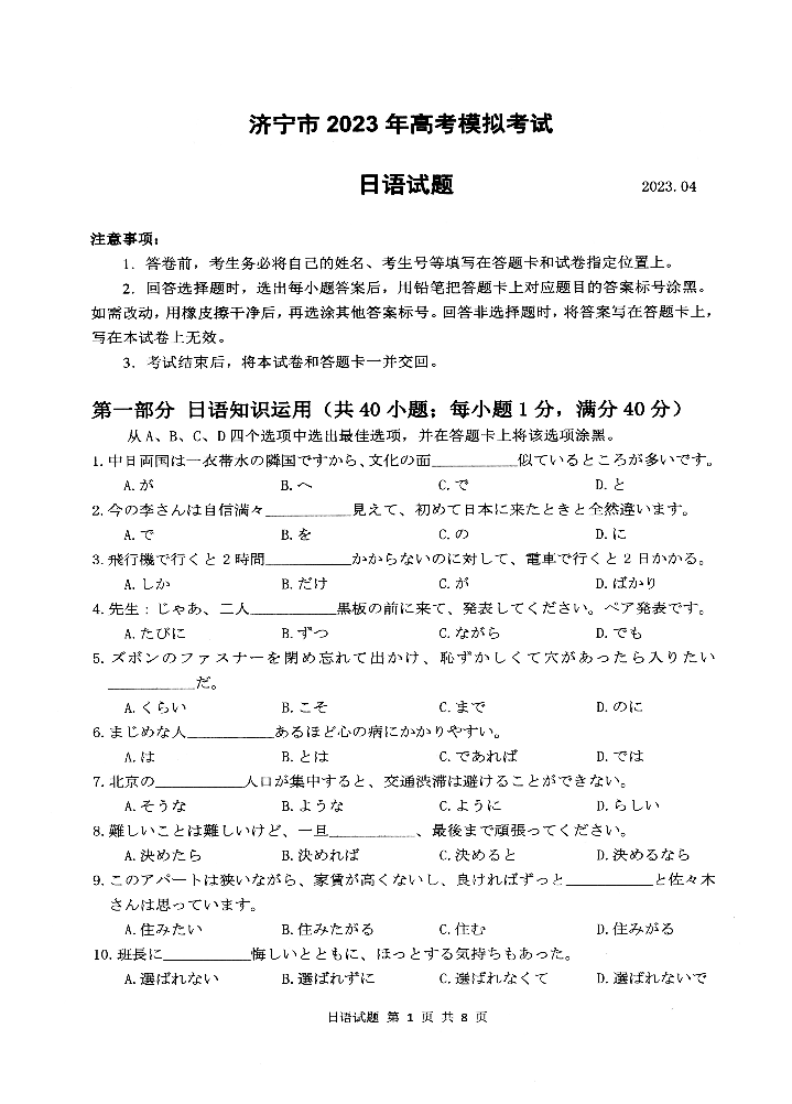 4山东省济宁市2023.4高三年级第二次模拟考试日语