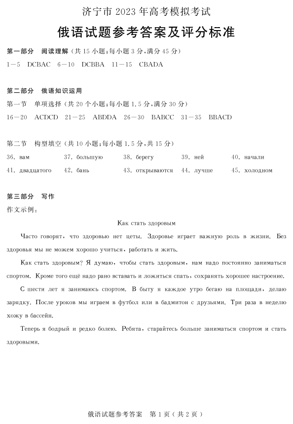 5山东省济宁市2023.4高三年级第二次模拟考试俄语答案