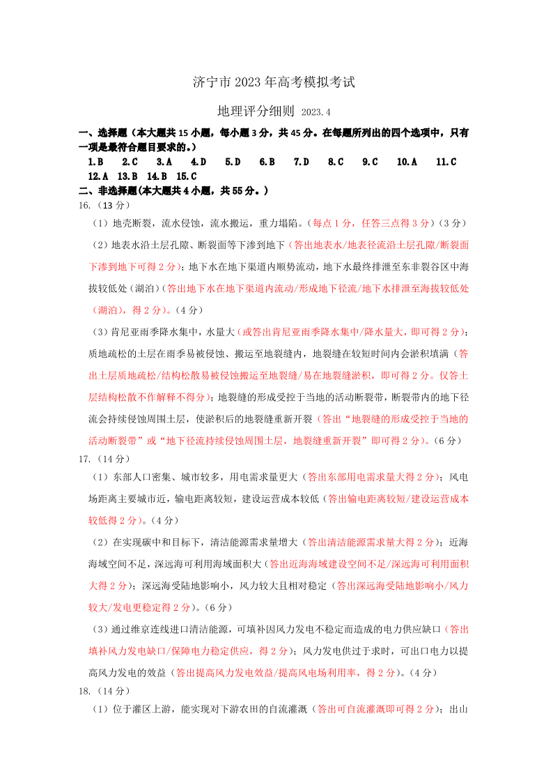 山东省济宁市2023.4高三年级第二次模拟考试地理答案