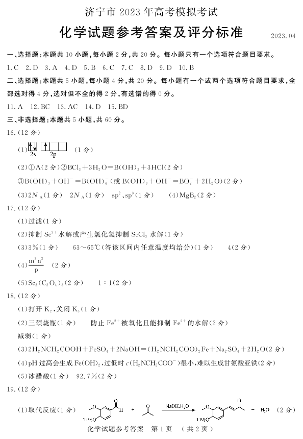 山东省济宁市2023.4高三年级第二次模拟考试化学答案