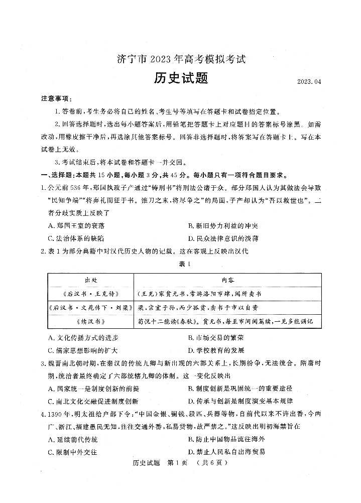 山东省济宁市2023.4高三年级第二次模拟考试历史