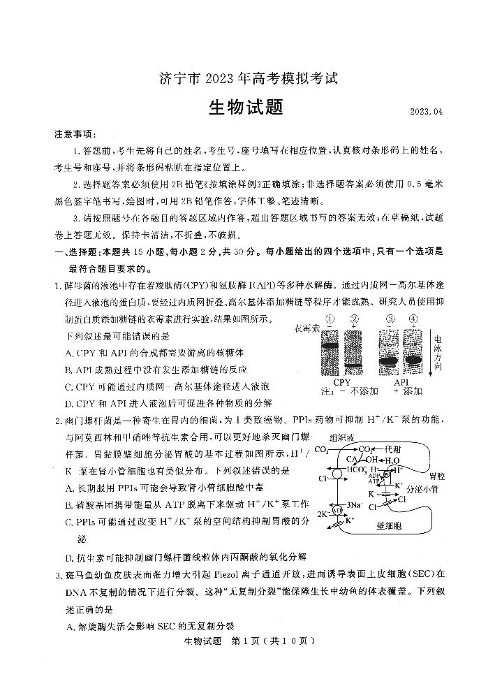 山东省济宁市2023.4高三年级第二次模拟考试生物