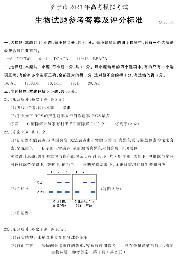 山东省济宁市2023.4高三年级第二次模拟考试生物答案