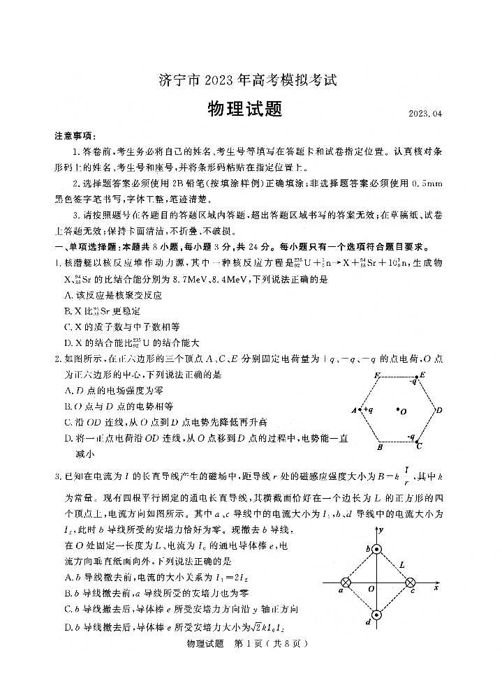 山东省济宁市2023.4高三年级第二次模拟考试物理