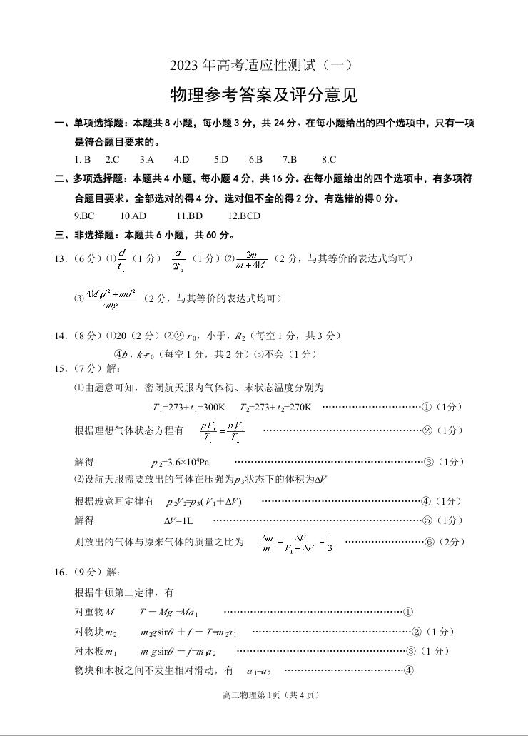 山东省烟台市2023.5高三年级第二次模拟考试物理答案