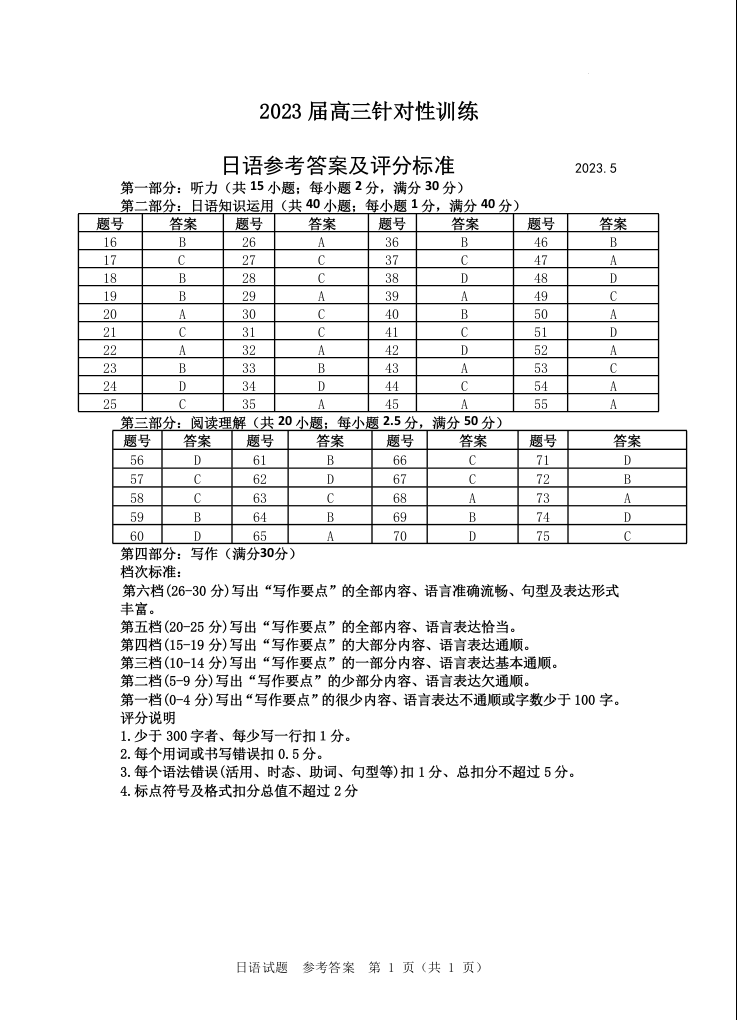 4山东省济南市2023.5高三年级第三次模拟考试日语答案