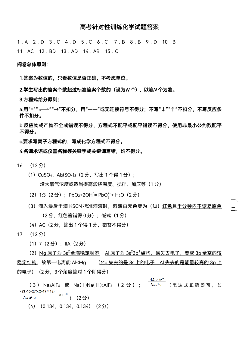 山东省济南市2023.5高三年级第三次模拟考试化学答案