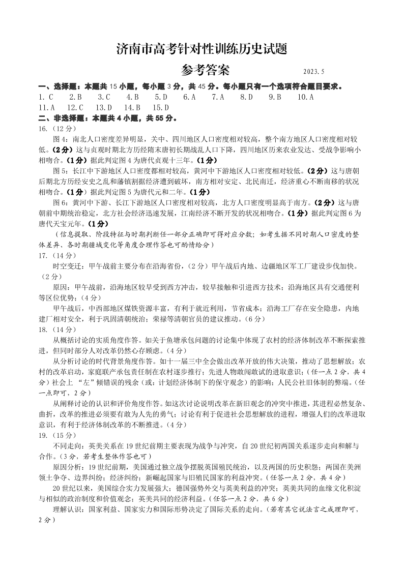 山东省济南市2023.5高三年级第三次模拟考试历史答案