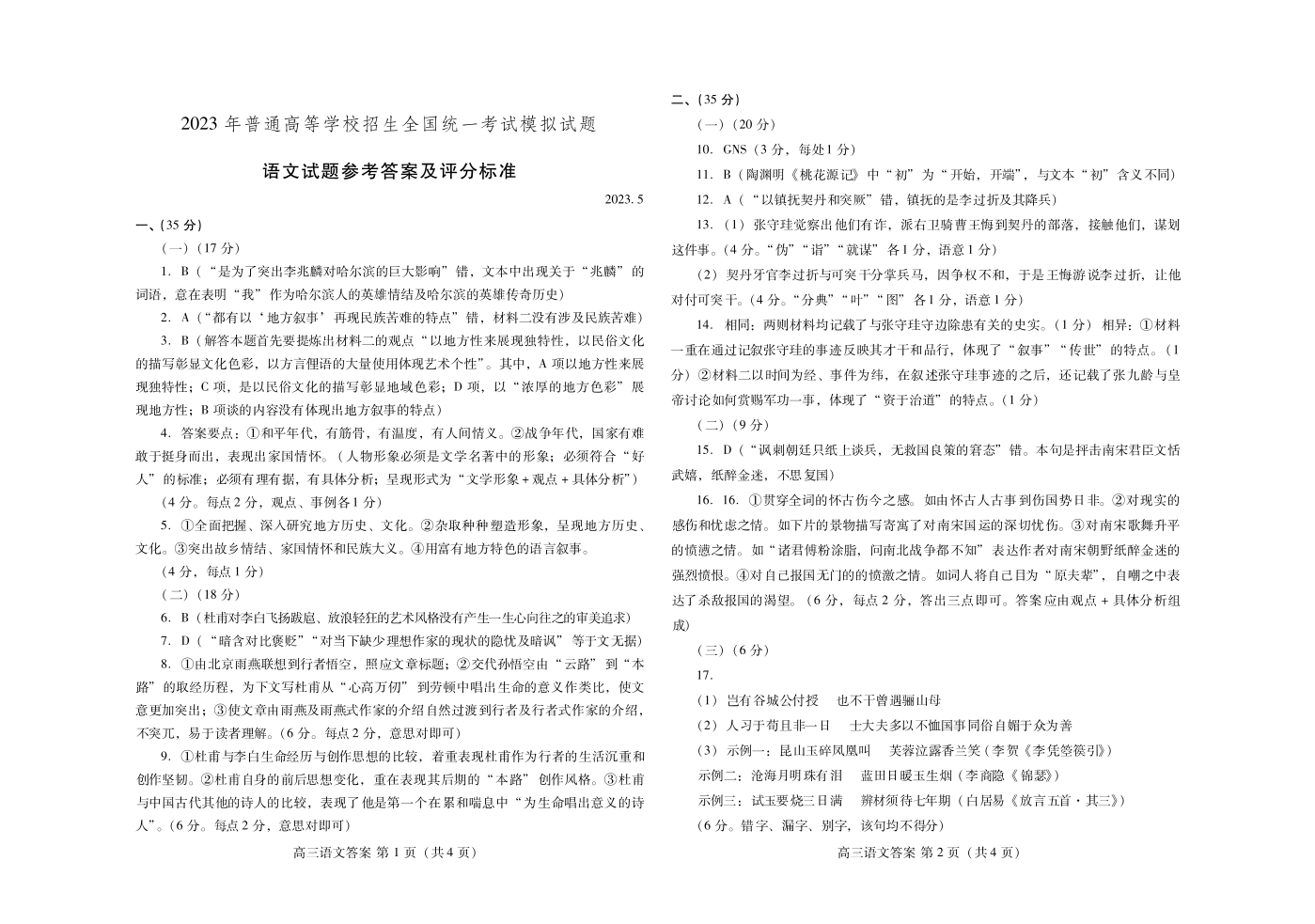 1山东省潍坊市2023.5高三年级第三次模拟考试语文答案