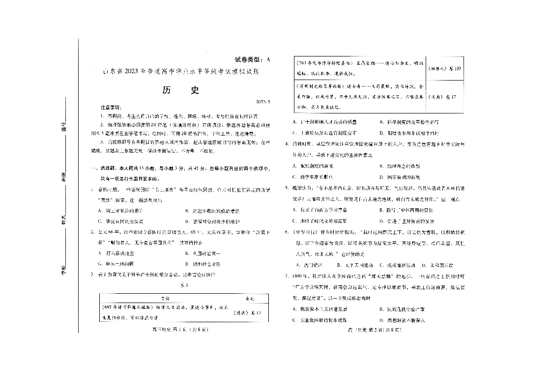 山东省潍坊市2023.5高三年级第三次模拟考试历史
