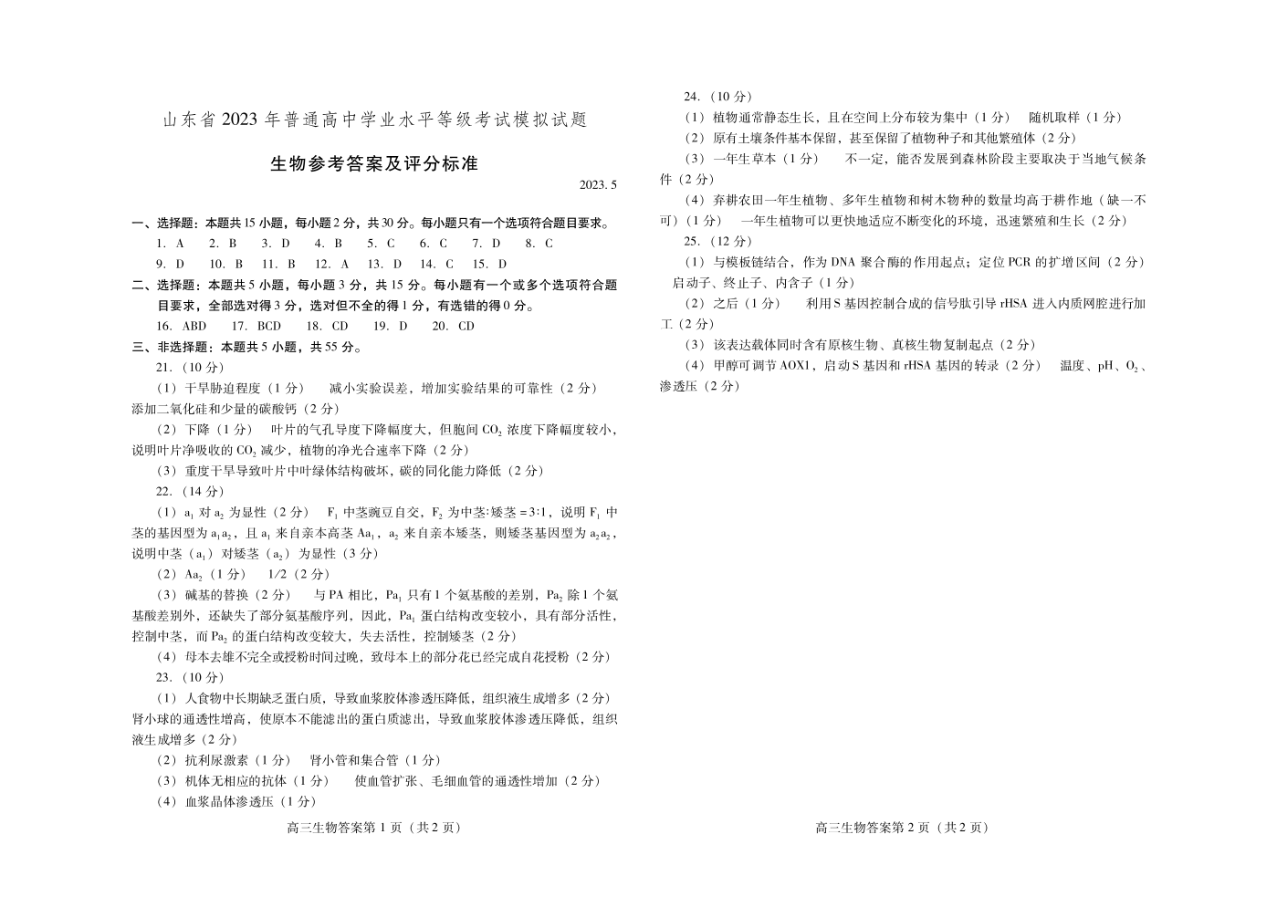 山东省潍坊市2023.5高三年级第三次模拟考试生物答案